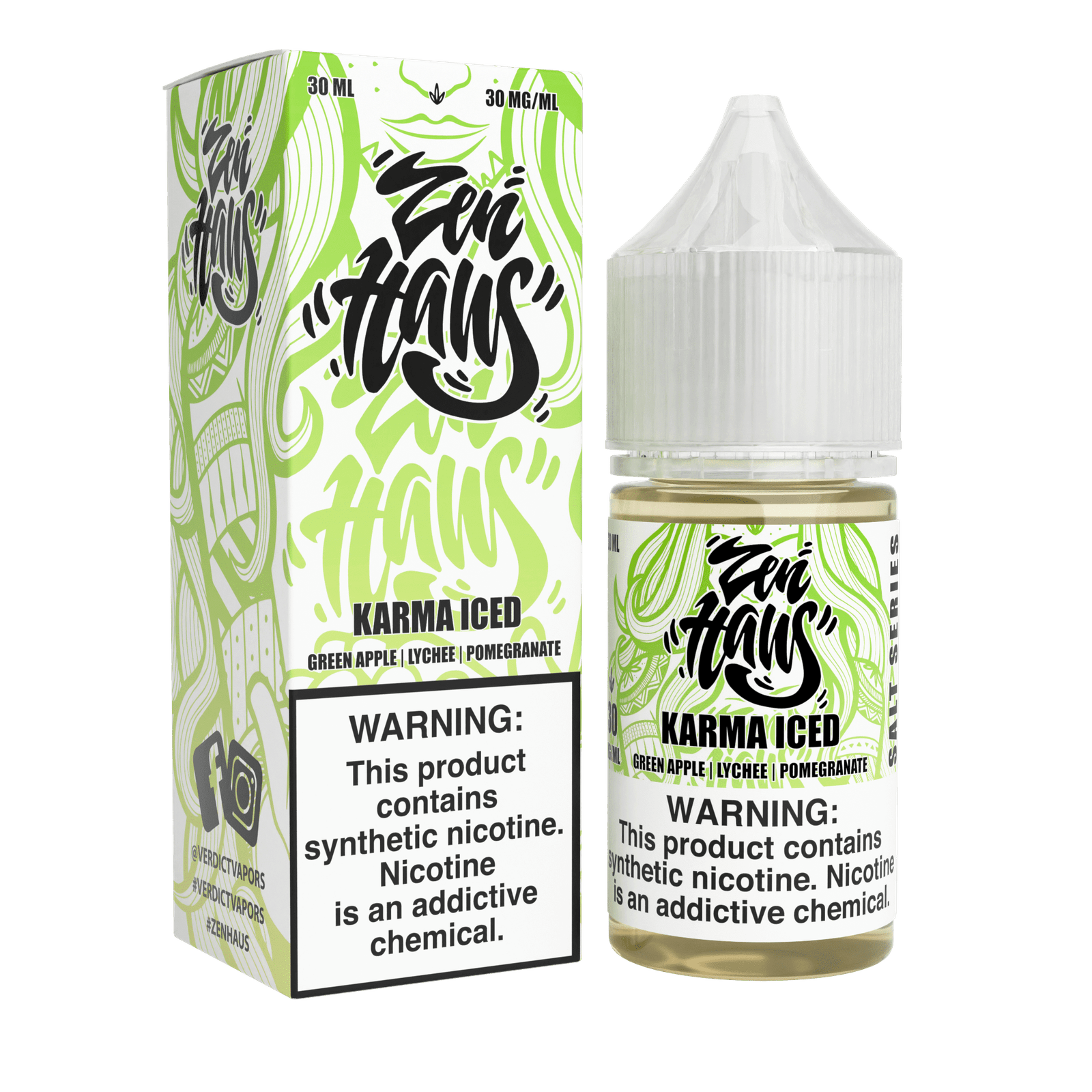 ZEN HAUS® Karma Iced Salt delivers a crisp blend of green apple, sweet lychee, and tangy pomegranate, perfectly poured over ice for a refreshingly balanced experience.