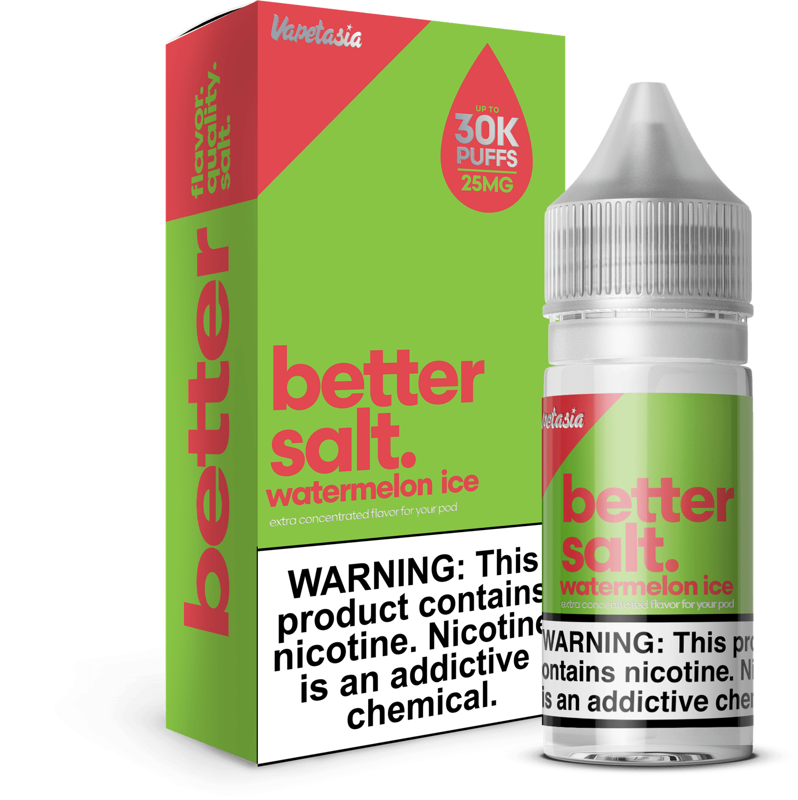 Better Salt® Watermelon Ice Salt: A chilled blending of juicy watermelon with an invigorating menthol finish. This sweet-and-cool combo delivers bold flavor and a smooth icy finish.