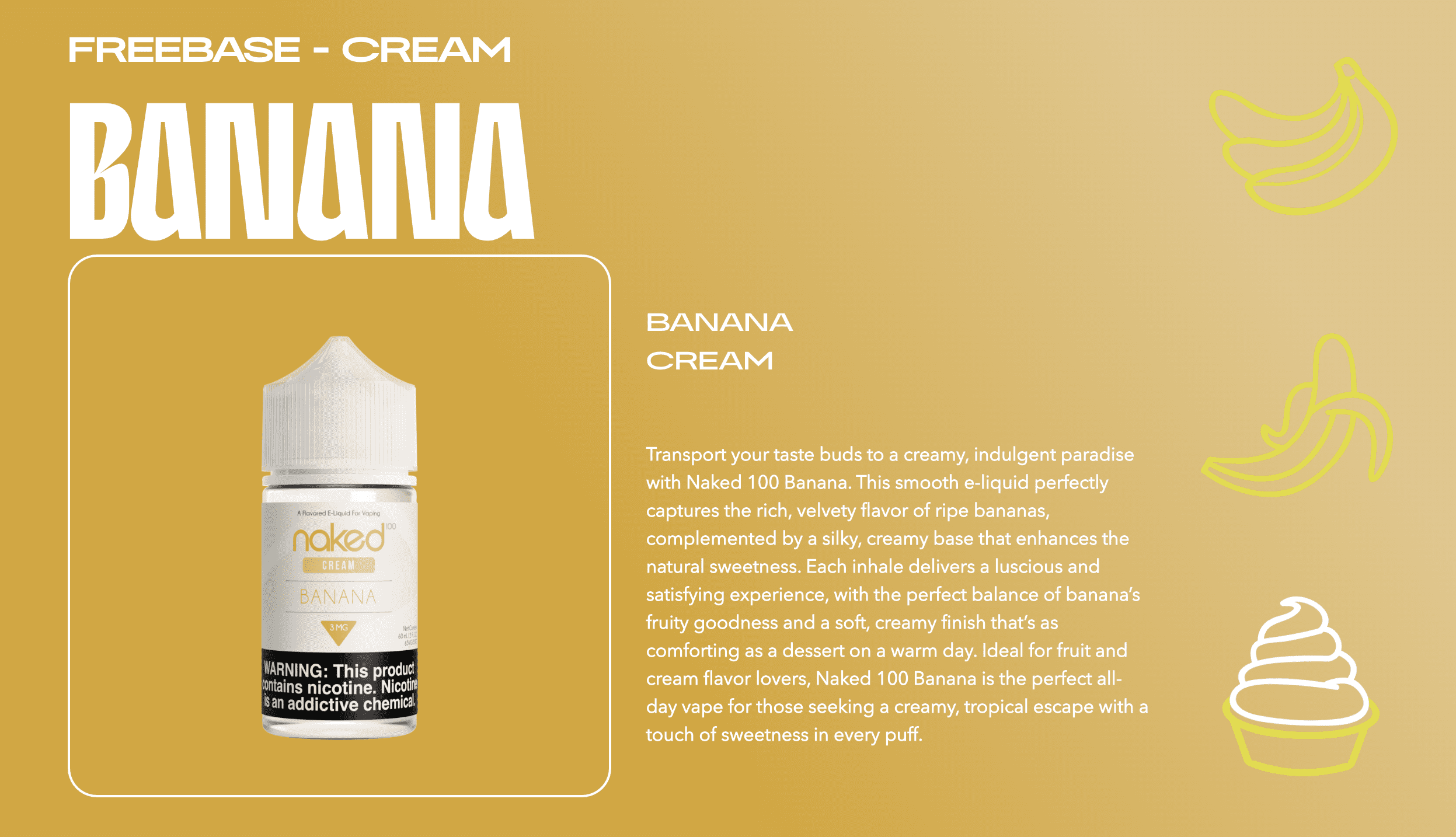 NAKED 100® Banana Cream delivers creamy banana layered with sweet, silky custard for a warm, indulgent vape with gourmet dessert appeal.