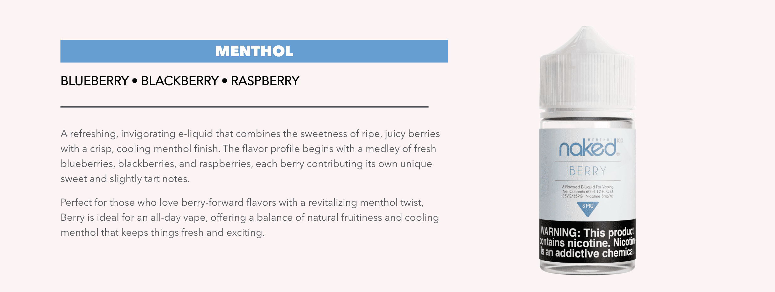 NAKED 100®Berry layers juicy blueberry, blackberry, and a touch of lemon into a vibrant medley, offering a sophisticated take on classic berry flavor.