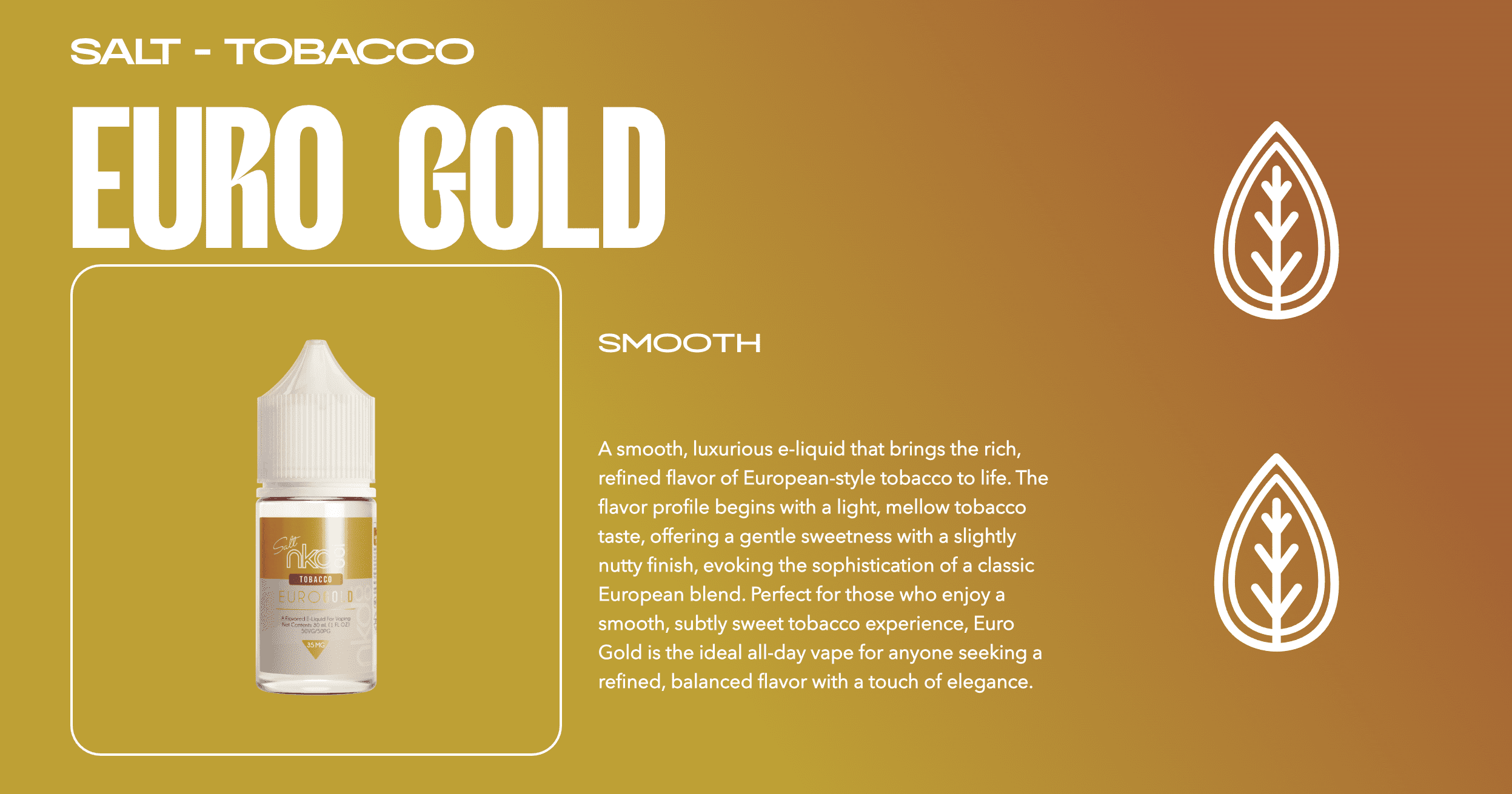 NAKED 100® Euro Gold Tobacco Salt offers a sophisticated blend of smooth, golden tobacco with delicate hints of sweetness and toasted richness.