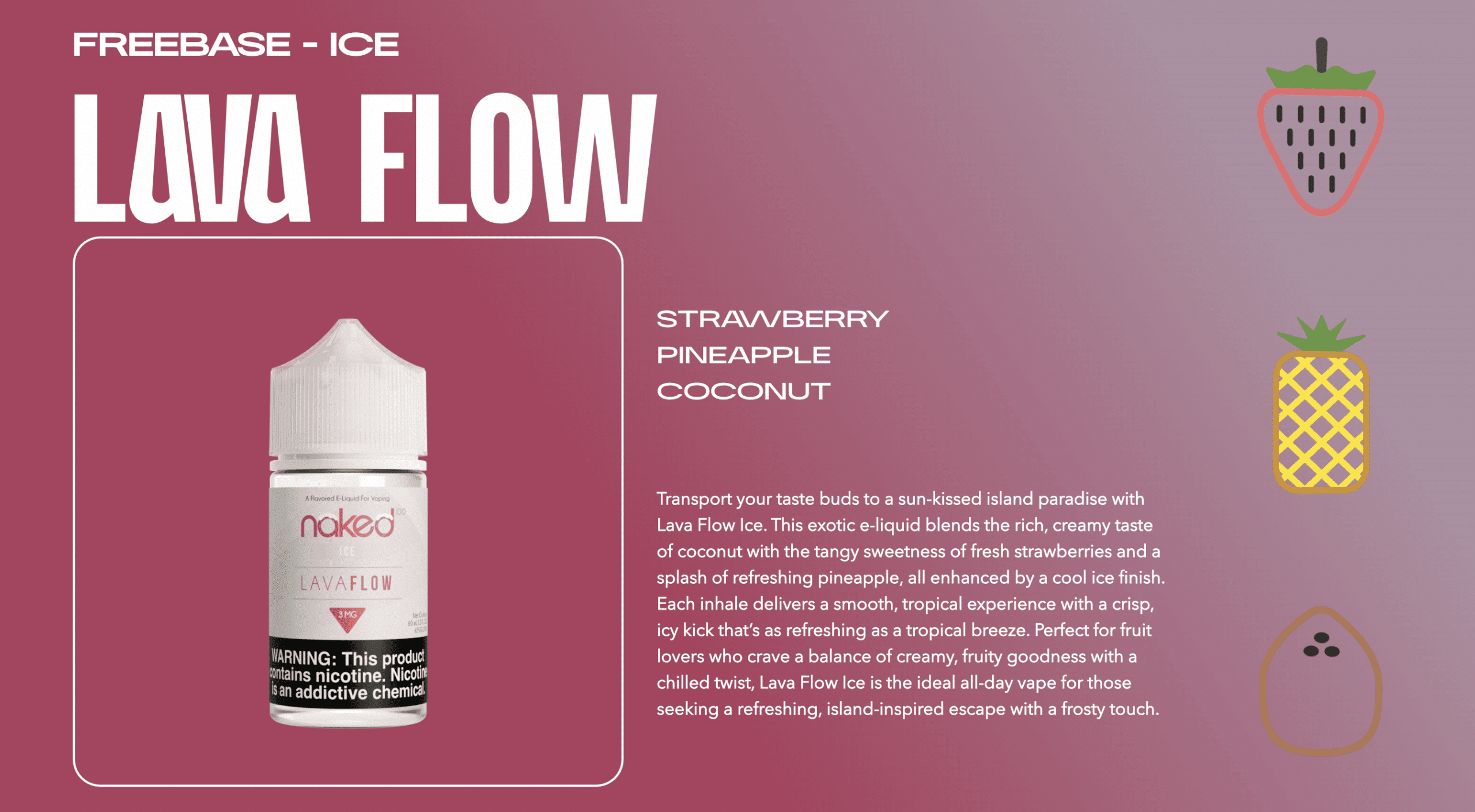 NAKED 100® Lava Flow Ice chills the tropical blend of pineapple, strawberry, and coconut with a cool menthol finish for an invigorating island escape.