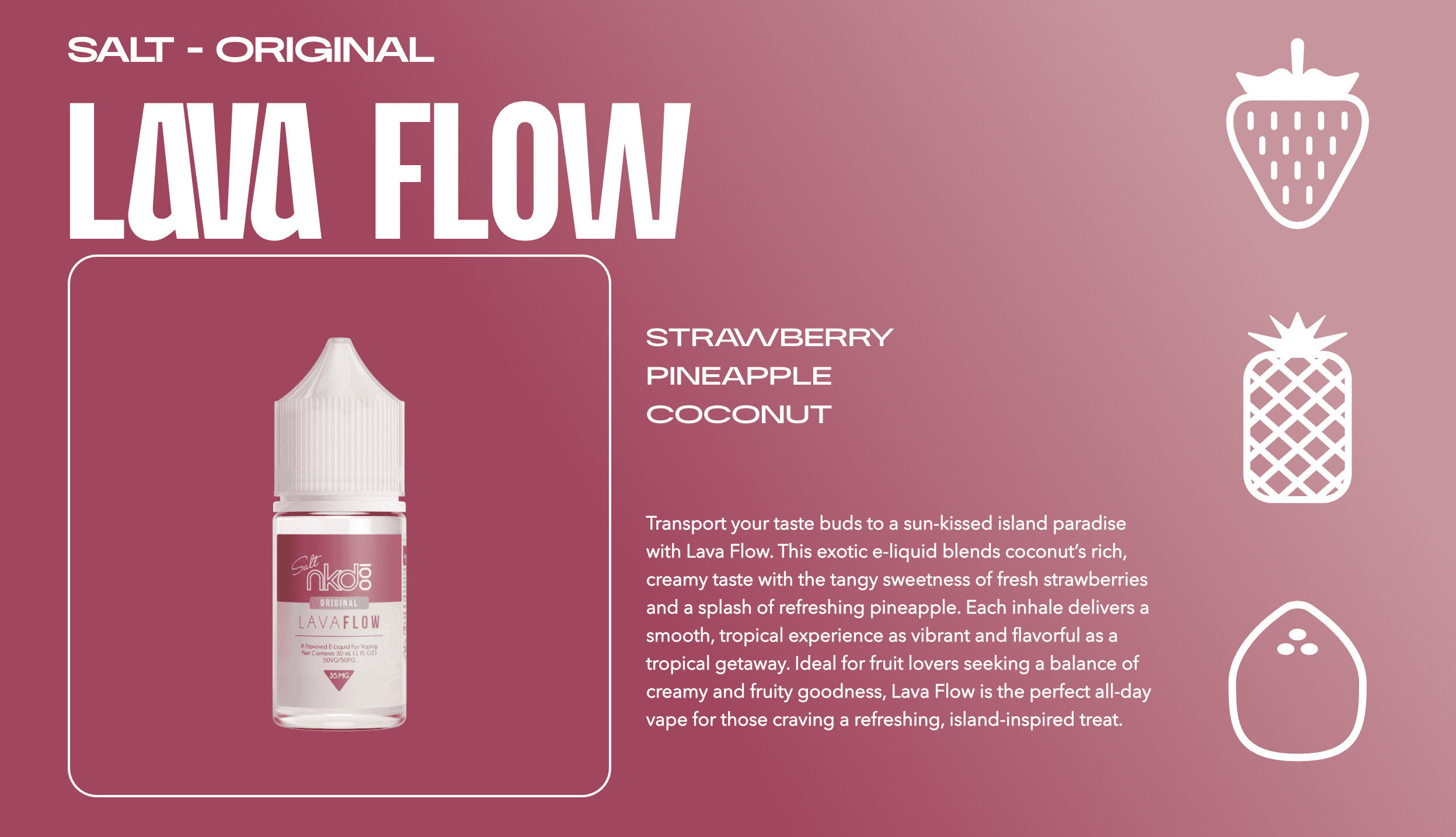 NAKED 100® Lava Salt blends rich tropical pineapple, ripe strawberries, and creamy coconut for a smooth, island-inspired vape that tastes as indulgent as a beachside escape.