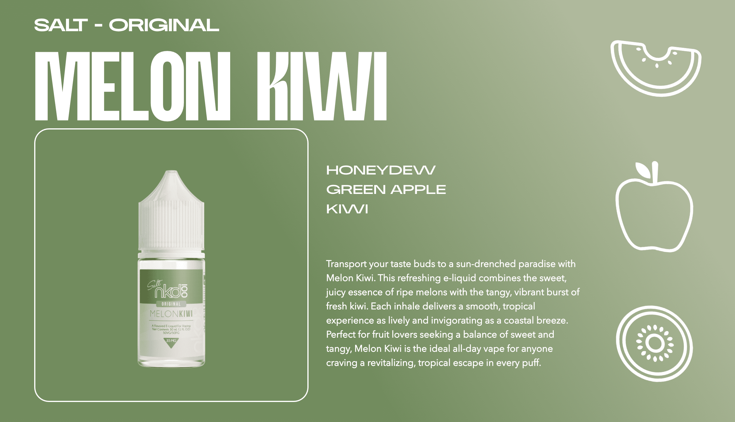 NAKED 100® Melon Kiwi Salt fuses luscious melon and tangy kiwi into a soft, refreshing blend that offers a crisp fruit flavor.