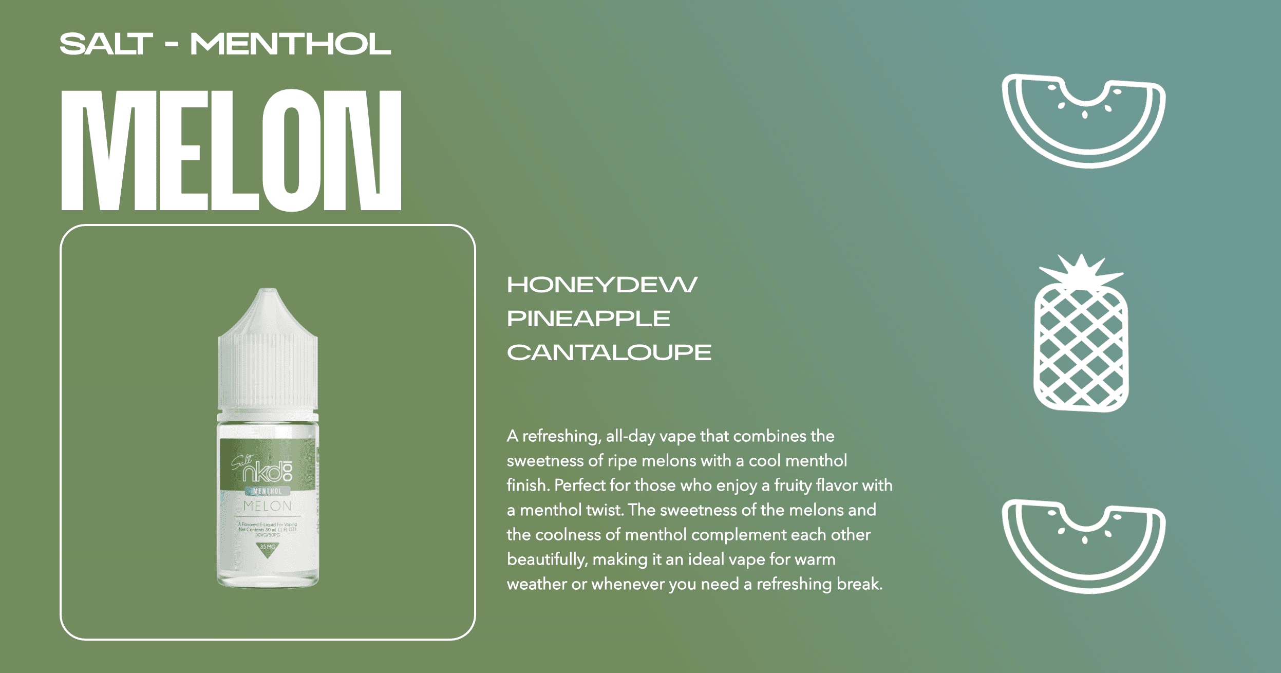 NAKED 100® 100 Melon Menthol Salt combines the sweet juiciness of ripe melon with an invigorating menthol finish for a vibrant, yet polished experience.